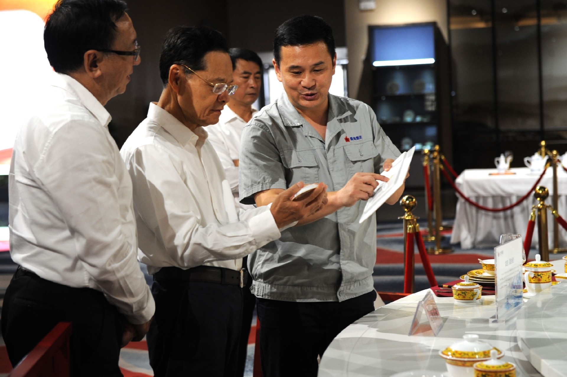 走進國瓷館,鄧景揚向陳武一行介紹了集團的基本情況,國瓷館展廳規(guī)模。鄧景揚介紹說,“國瓷館”是目前全世界最大的單一品牌陶瓷展廳。參觀時,陳武興致勃勃地拿起桌上的一套產(chǎn)品仔細端詳,鄧景揚適時介紹到:“這是我們新開發(fā)的一款產(chǎn)品,是一套組合餐具,該產(chǎn)品將日用陶瓷和藝術陶瓷巧妙結合,合起來是一個花瓶的造型。”“這個不錯,有創(chuàng)意!是紅葉品牌嗎?”陳武問道?!斑@是我們集團旗下一個“百花”品牌的產(chǎn)品。”隨即,鄧景揚向陳武介紹了景陶集團發(fā)展脈絡和以“國瓷紅葉”為主打品牌,金品陶、百花、家好系統(tǒng)品牌特色,集聚綻放的特點。期間,鄧景揚講述了“紅葉”與“御窯”前世今生的關系和如何將“紅葉”產(chǎn)業(yè)和陶瓷文化進一步做大做強制定的新的發(fā)展愿景。鄧景揚介紹道,“我們集團的發(fā)展愿景是做世界上最精美的瓷器,創(chuàng)百年一流企業(yè),讓‘紅葉’成為世界知名的日用陶瓷中國民族品牌,用陶瓷講好中國故事,展中華文化風采,讓‘紅葉’成為中華文化走向世界的文明使者?!标愇渎牶蟊硎臼终J可和贊同,并勉勵景陶集團進一步發(fā)揮好景德鎮(zhèn)陶瓷龍頭企業(yè)的帶頭作用,讓紅葉陶瓷真正走出去。